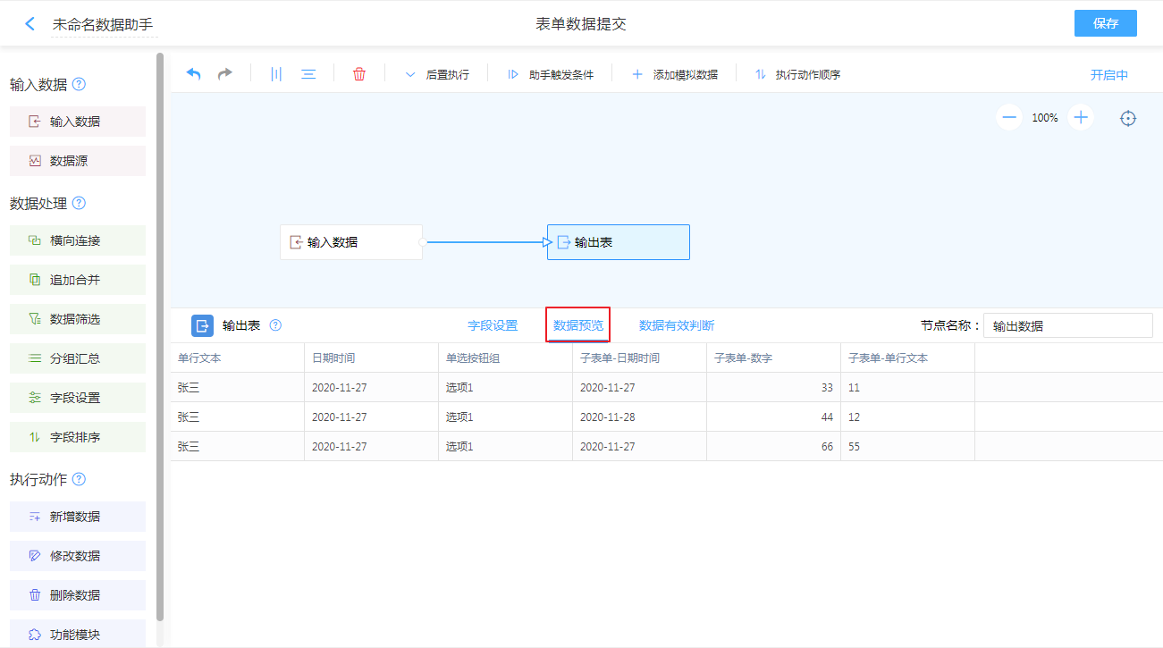 注意:在【表单属性】——【表单提交/编辑/删除数据】新建数据助手并且助手为前置执行时,当结果集为空时,执行中断,不允许提交/编辑/删除数据。