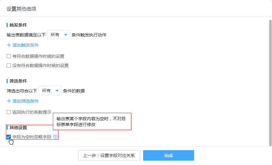 该功能只有“修改数据”节点才有,输出表某个字段内容为空时,不对目标表单字段进行修改。